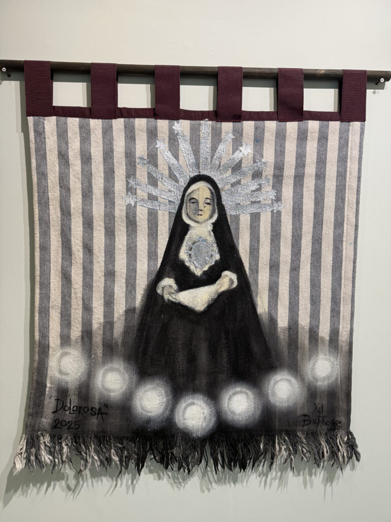 Levanto la mirada y me consigo con una virgen incrustada entre texturas, color y una historia que te hace ruido en la cabeza… de esas que te hacen pensar: ¿qué estoy viendo? Hay algo muy potente ahí, lo mítico se siente casi presente. Son obras que cuentan historias, de un país, de una región… de origen. De esas muestras que te dejan con ganas de salir de ahí y comprarte un pasaje para entenderlo todo desde la raíz.